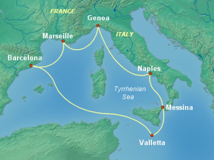 Barcelona> Marseille> Genoa> Naples> Messina> Valletta> Sea Day> Barcelona
