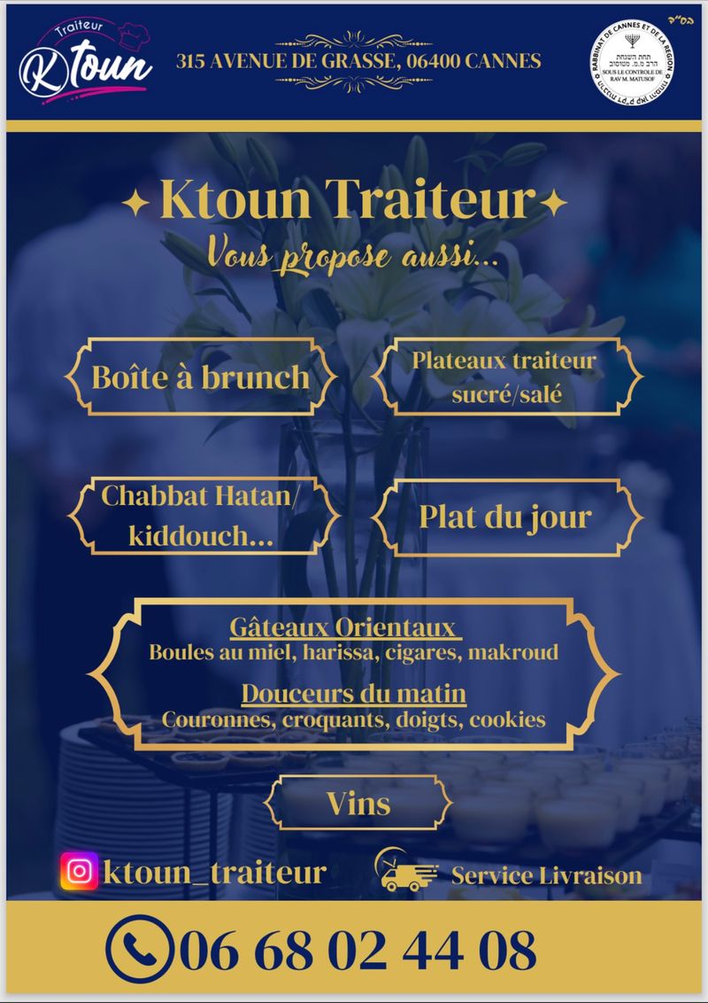 Frequently asked questions Which kosher authority supervises Ktoun Traiteur? The establishment operates under the strict kashrut supervision of the Rabbinat de Cannes et Région, led by Rav Matusof.