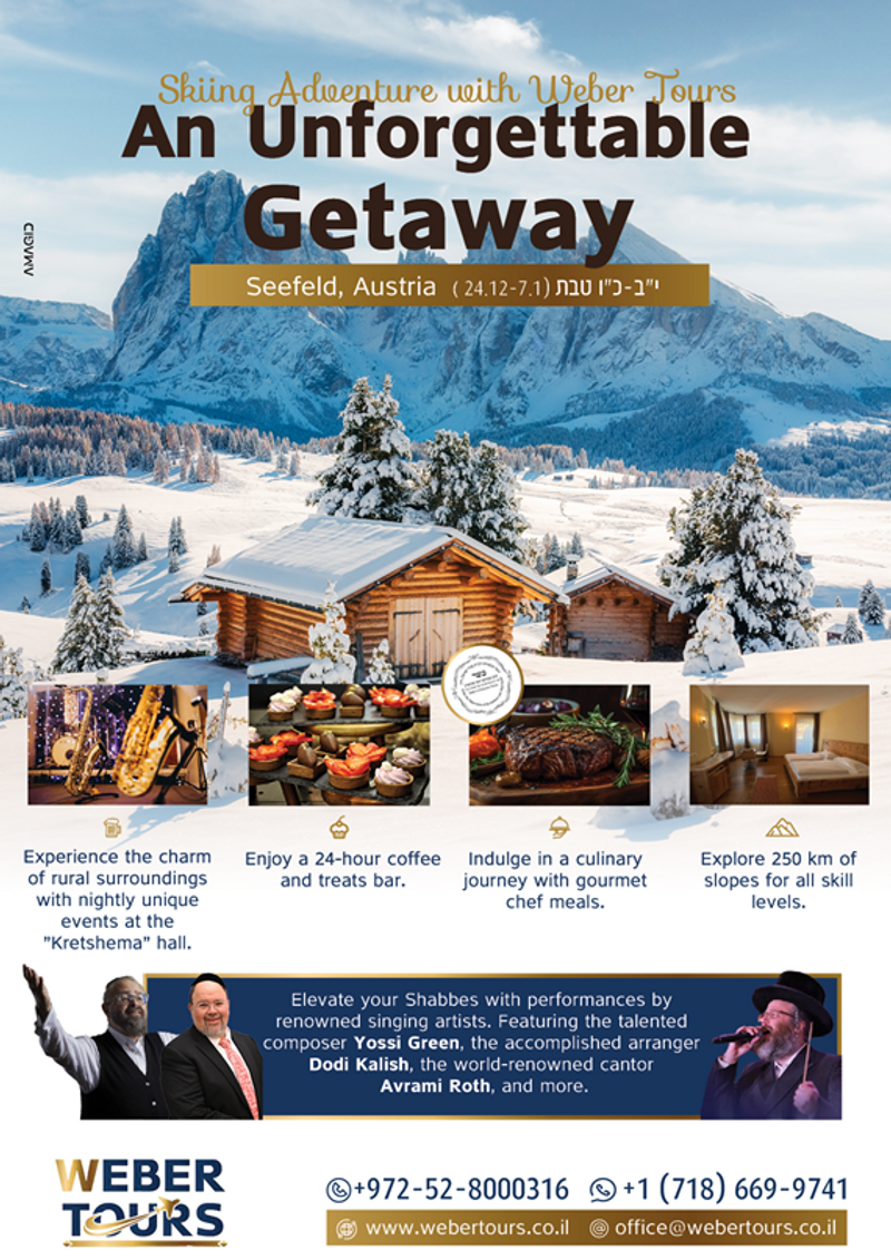 Our company specializes in vacations for the ultra-Orthodox and religious public and offers a dream winter vacation, high-class chef meals in the best tradition of Weber Tours, in the fancy kosher of Rabbi A.Y. Schwartz Abd Kehal Hassidim Vienna In addition to skiing, the vacation also includes other activities, such as sledding, walking in the snow, and more