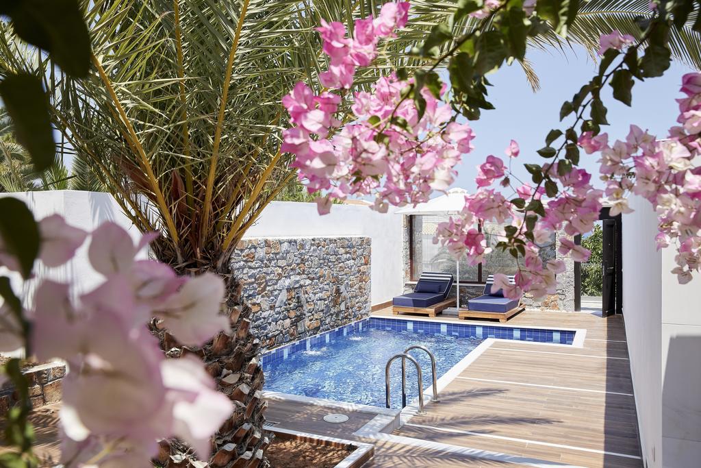 Spacious, modern rooms and suites, some with private pools, with balconies and terraces offering stunning views of the hotel's gardens and the Aegean Sea.