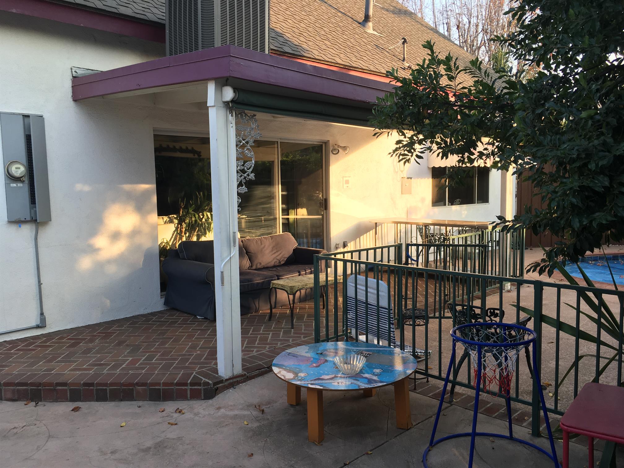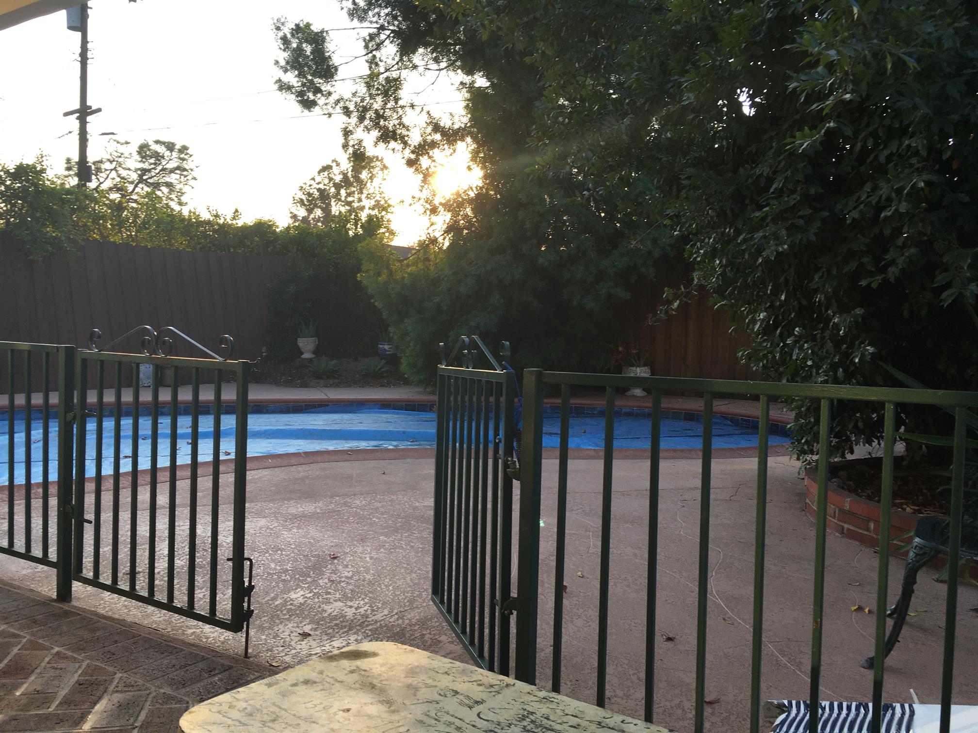 הבריכה היא בצורת כליות של 18,000 ליטר, בערך 15 על 30, בערך תשעה מטרים בקצה העמוק, עם מקלחת חיצונית. הוא מקבל שמש טובה ומתחמם עד אמצע שנות השמונים בקיץ, עם הרבה שימוש טוב לילדים. מהסתיו ועד האביב הוא נע בטמפרטורה בין שנות השבעים הגבוהות לשישים. יש לו כיסוי פלסטיק חזק הניתן להסרה ידני כדי לעזור לשמור על החום ולהפחית את האידוי. אין מצילים או שירותי פיקוח, ואתה ושלך תשחו על אחריותכם בלבד.