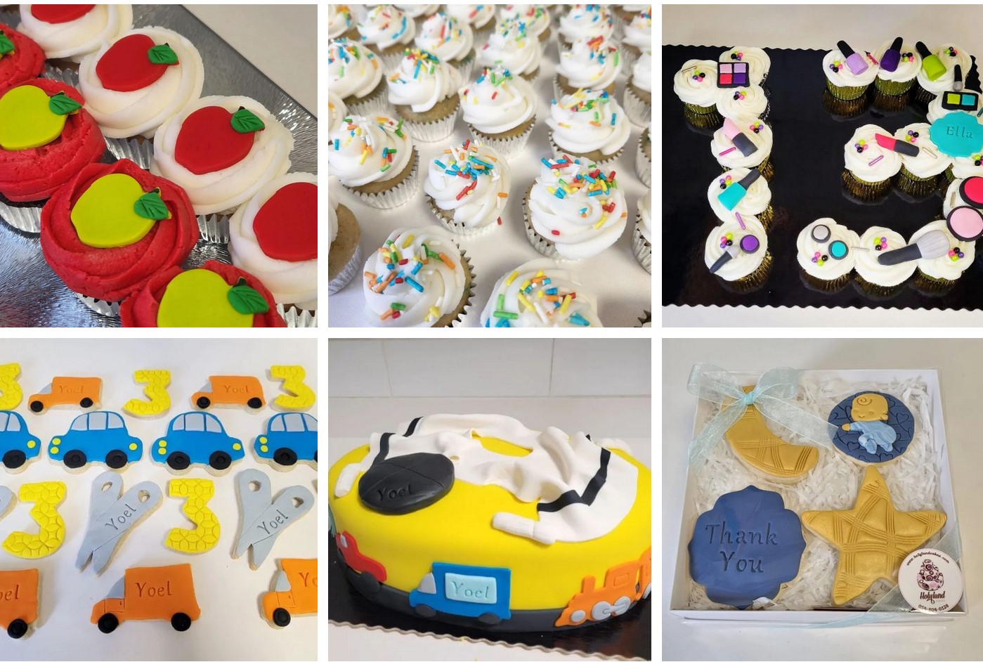 Cakes, cookies, cakepops, wrapped trays of goodies, cupcakes,
