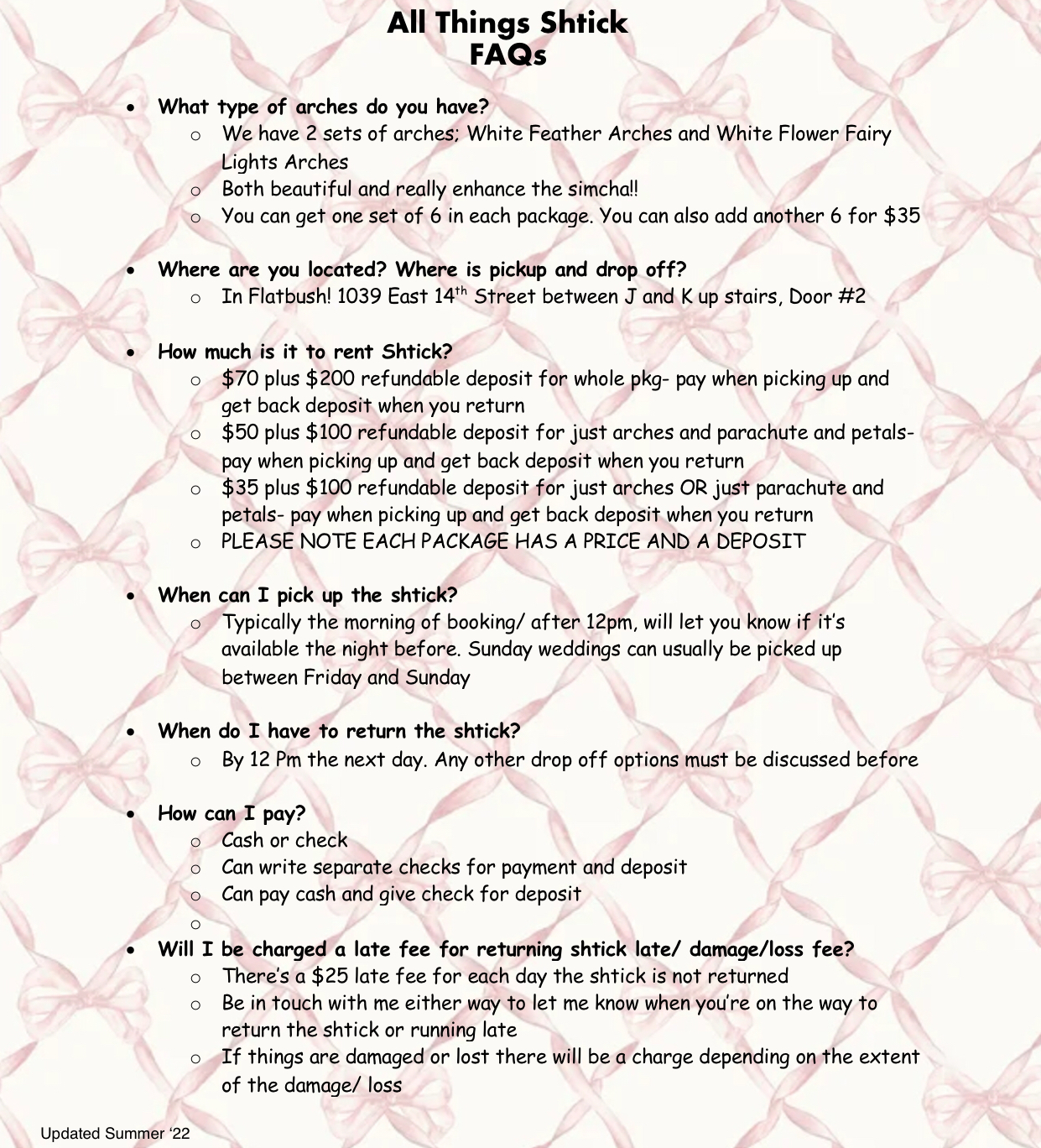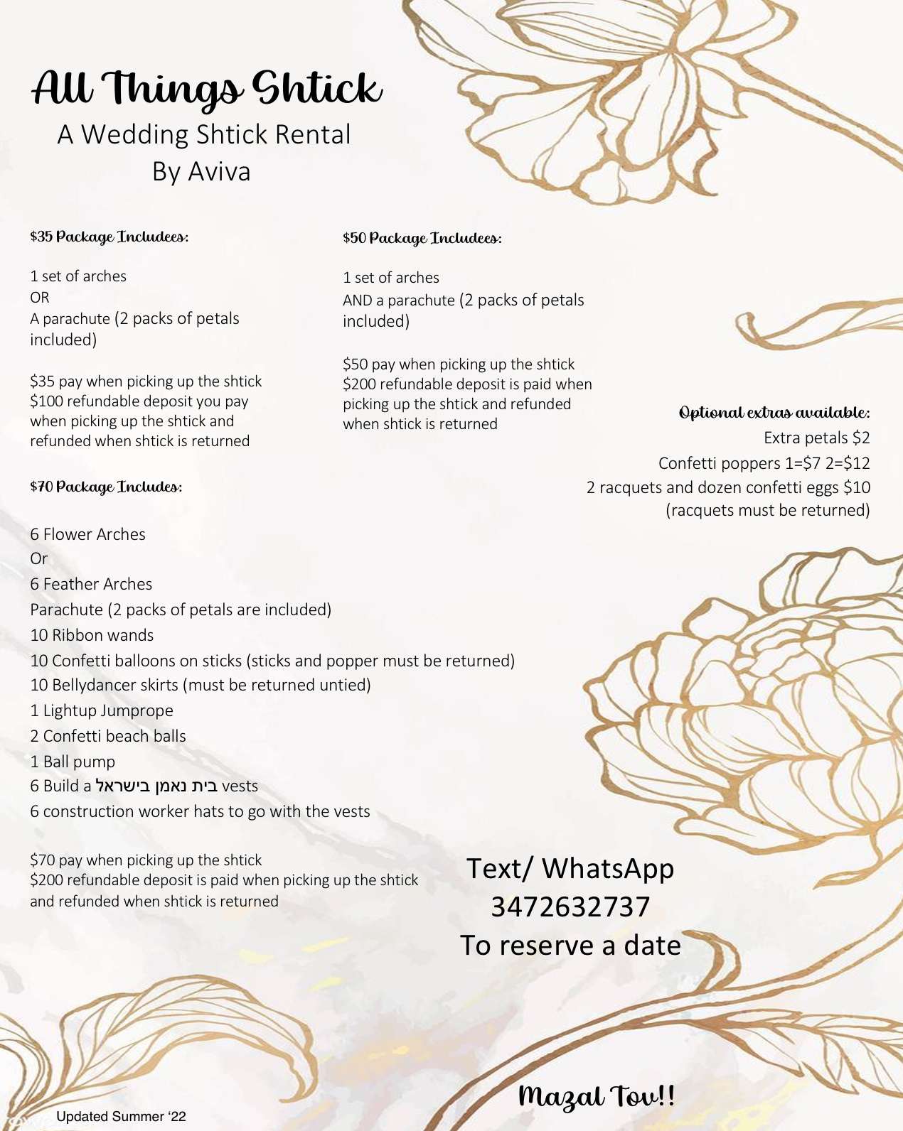 We offer a variety of wedding shtick including arches. parachutes with petals, belly dancer skirts, confetti balloons, confetti poppers…