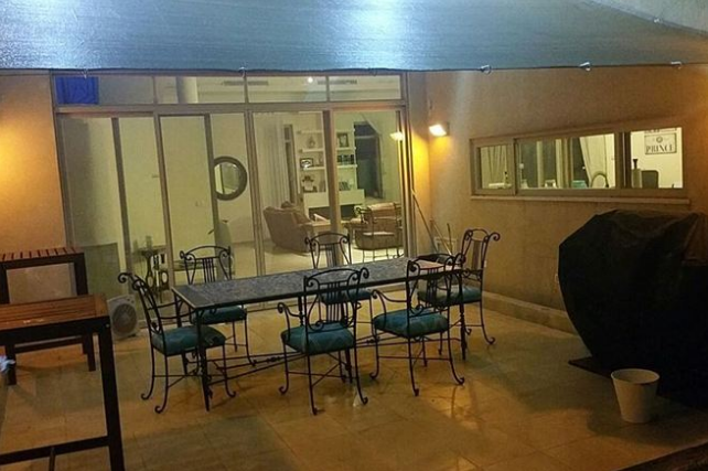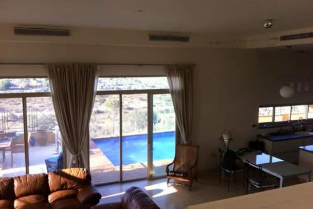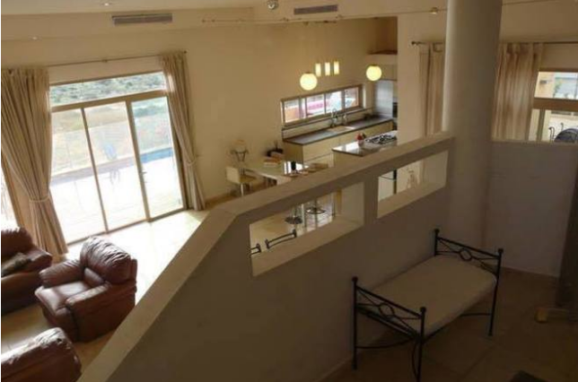 הסלון הגדול של 60 מ"ר צמוד לבריכת השחייה והמרפסת שלה, הוא נותן גישה גם למטבח.