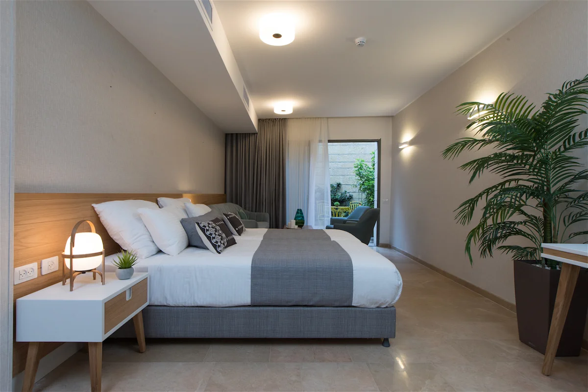 Rooms include free WIFI, luxurious and fully equipped bathroom, advanced air conditioning systems, designer furniture, advanced lighting fixtures, and solid wood doors. The tall, special room windows are memorable in their beauty and provide the hotel with an authentic look that blends elegantly with the Jerusalem stone.