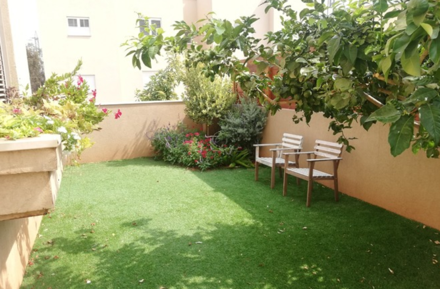 יש גם כיסא נדנדה בגינה ירוקה ופורחת.